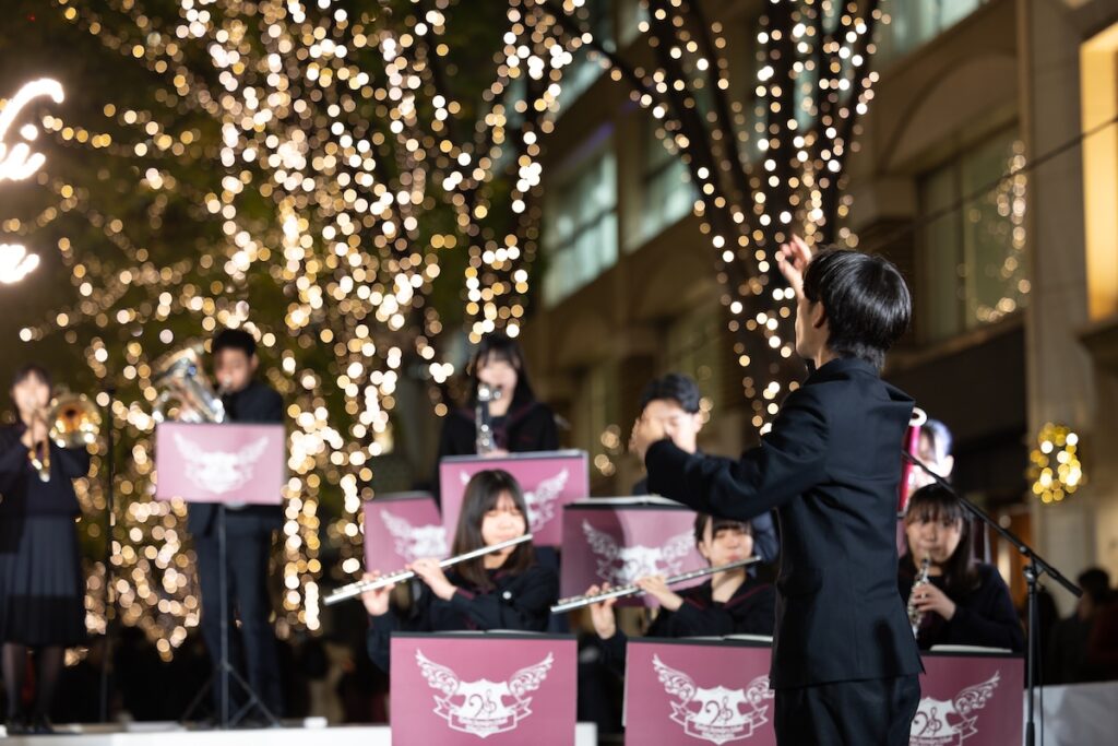「丸の内イルミネーション 2025」の初日となる11月13日には、丸の内仲通りで点灯式が開催されました。千代田区立九段中等教育学校の吹奏楽部とアーティストのSamiElu氏による特別なウェルカム演奏によって華やかにイベントがスタート。「赤鼻のトナカイ」などを演奏し、会場は一気にクリスマスムードに。その後、登壇者による挨拶が行われました。