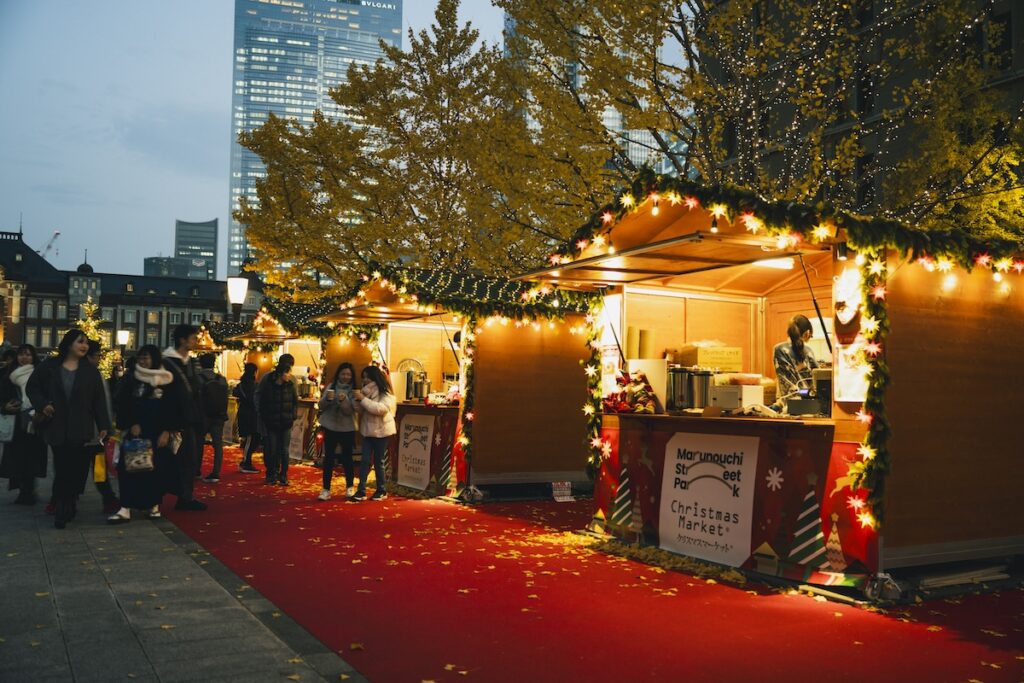 このイルミネーションと連動する形で、歩行者中心の公共空間の使い方を検証する社会実験「Marunouchi Street Park 2025 Winter」も同時期に実施されました。2025年は丸の内仲通りで従来開催しているクリスマスマーケットを初めて行幸通りにも展開、クリスマスツリーを設置し多くの人が来場しました。