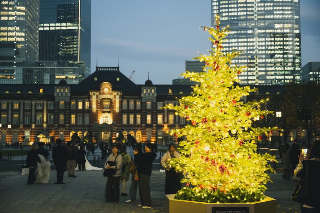 東京駅を背景にクリスマスツリーが輝く光景は珍しく、インバウンド客など多くの人が立ち止まって写真撮影し、その景色を楽しんでいました。
