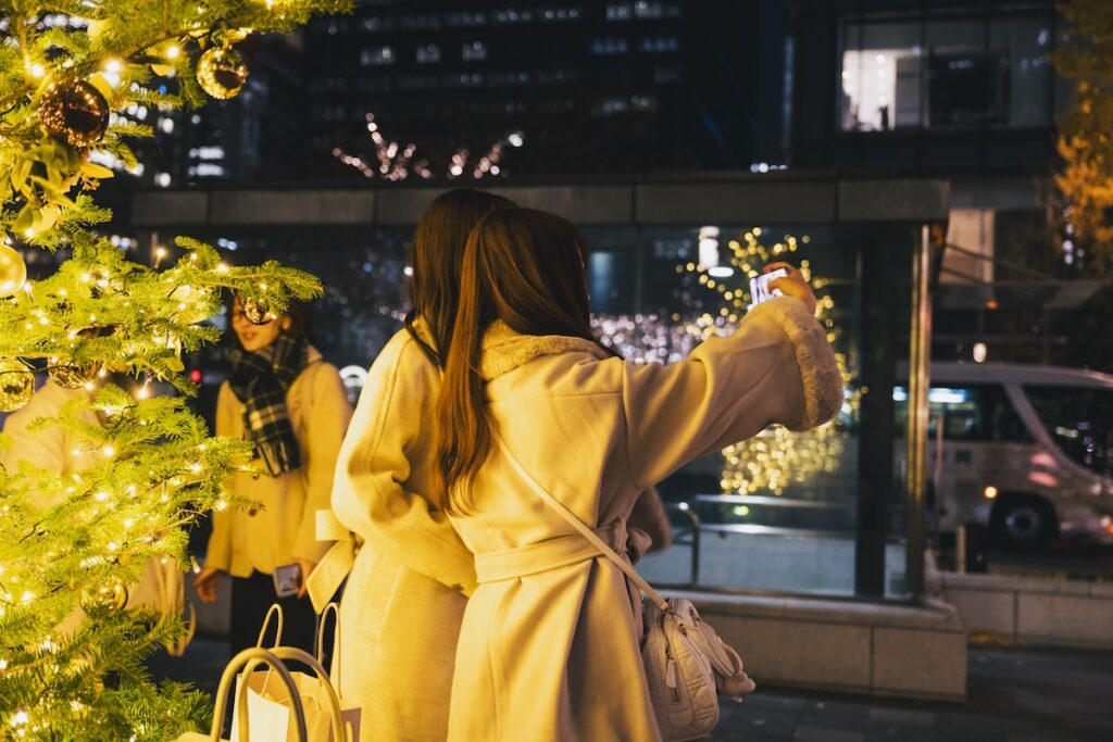 そして、なんといっても今年初設置となるクリスマスツリーには多くの人がフォトスポットとして集まりました。約4メートル、4つの本物のもみの木を使用したツリーは、赤やゴールドカラーのオーナメントに彩られ、行幸通りを眩く照らしました。